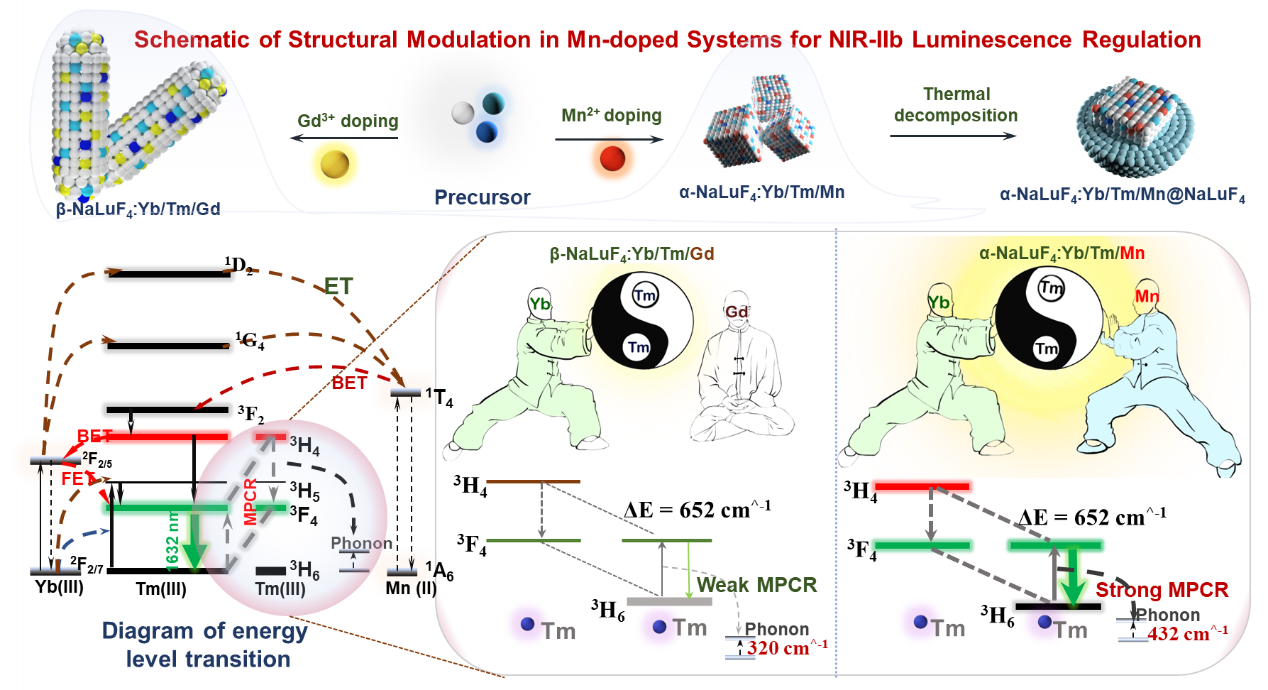 NIR-II(1000-1700 nm)光学成像凭借低光子散射、深层组织穿透的独特优势,在无创体内光学诊断领域展现出巨大潜力,成为生物医学成像技术的重要发展方向。其中,1600-1700 nm的NIR-IIb子波段因进一步降低的水和组织的光子吸收与散射,理论上可实现更高的信噪比(SNR)和成像深度。然而,当前主流的钕(Nd)、钬(Ho)、铒(Er)基纳米探针发射波长多局限于1000-1550 nm,难以覆盖1600 nm以上的NIR-IIb波段;同时,铥(Tm)基纳米晶体虽存在1600-2100 nm的发射跃迁(3F4→3H6),但传统高温共沉淀或水热法制备的纳米晶体多为六方相(β相),严重抑制1600 nm以上的发光强度,无法满足深层组织高分辨率成像需求。因此,开发高性能NIR-IIb波段(>1600 nm)荧光发射、兼具高稳定性与生物相容性的纳米探针,成为突破现有成像技术瓶颈的关键。